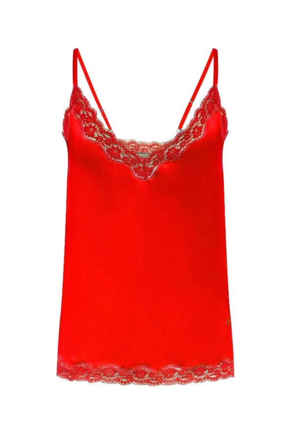 Ce caraco en soie stretch rouge est bordé de dentelle couleur noire au dessin floral.